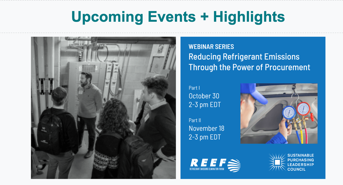Join us Thursday, October 30 as SPLC and REEF launch the first part of a two-part series on sustainable refrigerant procurement. Learn why refrigerants are a hidden climate lever and how your procurement decisions can reduce emissions, walk through our new Guidelines with technical experts, and connect directly with peers advancing low-impact cooling.